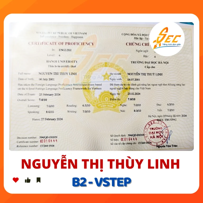 ✅Thầy Đạt là một cựu sinh viên xuất sắc của ĐH Bách Khoa Hà Nội, đạt học bổng 9/9 kỳ học. Thầy là người sáng lập Trung Tâm Anh Ngữ SEC và phương pháp dạy tiếng Anh đơn giản chỉ với 3 Công Thức. Hiện nay, thầy Đạt đang giảng dạy tại SEC và giữ vị trí Giám đốc Trung tâm. Thầy đã hoàn thành chứng chỉ nghiệp vụ sư phạm, đạt 975/990 điểm TOEIC, và chứng chỉ giáo viên tiếng Anh Quốc tế TESOL do ĐSQ Úc cấp. Với lối giảng bài cuốn hút, hấp dẫn, hóm hỉnh và thấu hiểu tâm lý học viên, thầy Đạt luôn truyền cảm hứng mạnh mẽ đến từng học viên.