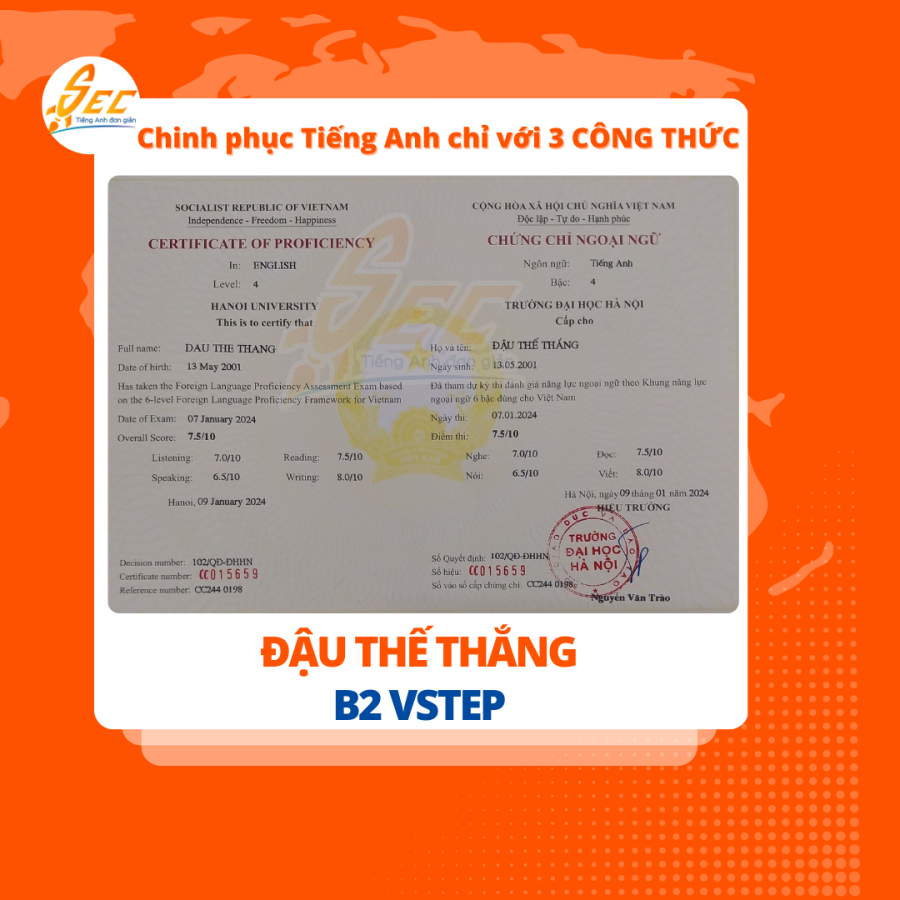 👉 Cam Kết Đầu Ra: Khóa học B1, B2 tại SEC cam kết giúp học viên đạt được chứng chỉ B1, B2 như mong muốn. Nếu học viên không đạt được mục tiêu đề ra, SEC cam kết học lại hoàn toàn miễn phí.
